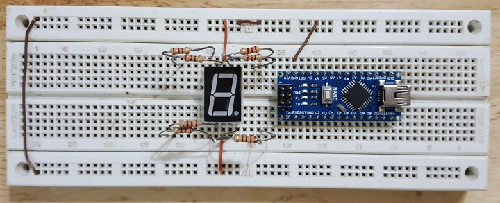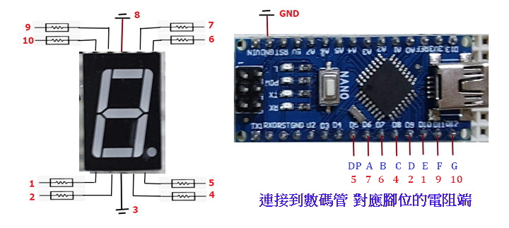 於 setup() 函數內設定 Nano 對應到數碼的PIN 均為 OUTPUT